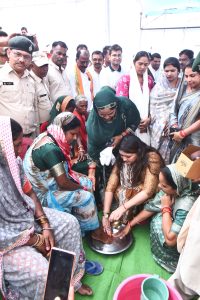 पंडरिया विधायक भावना बोहरा ने तेंदूपत्ता संग्राहक महिलाओं के पैर पखार कर अपने हाथों से पहनाई चरण पादुका