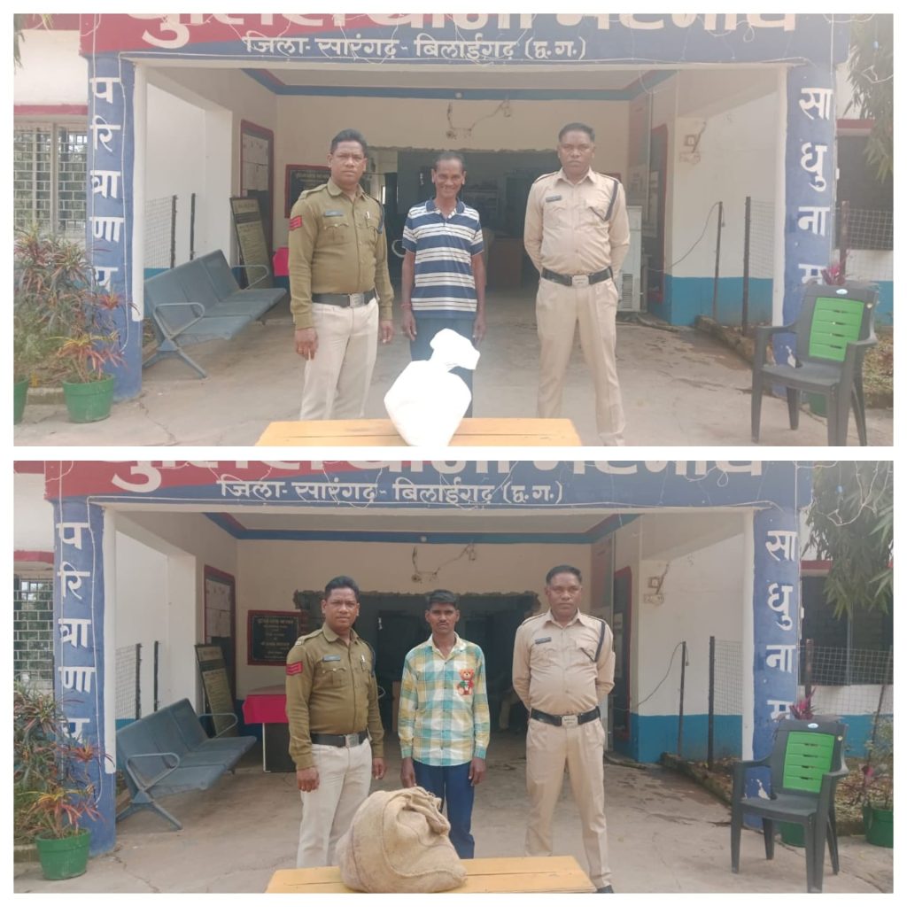 श्रीमान पुलिस अधीक्षक महोदय श्री पुष्कर शर्मा के द्वारा अवैध शराब,जुआ,सट्टा, गांजा जैसे थाना क्षेत्रों में होने वाली अवैधानिक कार्यो में संलिप्त व्यक्तियों के विरूद्ध सख्त कानूनी कार्यवाही करने की निर्देश पर अतिरिक्त पुलिस अधीक्षक महोदया निमिषा पांडे एवं SDOP विजय ठाकुर महोदय बिलाईगढ़ के मार्गदर्शन में थाना प्रभारी सउनि भगवती प्रसाद कुर्रे के नेतृत्व में दिनांक 30.01.2025 को भटगांव नगर में रेड कार्यवाही कर आरोपी कृष्ण लाल धीवर के कब्जे से बिक्री करने हेतु रखें एक जुट बोरा में 160 पाउच सफेद झिल्ली में कुल लगभग 40 लीटर अवैध कच्ची महुआ शराब कीमती 8000 रूपये एवं एक अन्य प्रकरण में आरोपी दुकालू राम नागवंशी के कब्जे से बिक्री करने रखा एक सफेद रंग की बोरी में 40 पाउच झिल्ली में लगभग 10 लीटर महुआ शराब कीमती 2000 रुपए जप्त कर,आरोपियों विरूद्ध अपराध धारा 34(2) आबकारी अधिनियम के अर्न्तगत पृथक पृथक कार्यवाही कर गिरफ्तार कर न्यायिक अभिरक्षा मे जेल भेजा गया है।