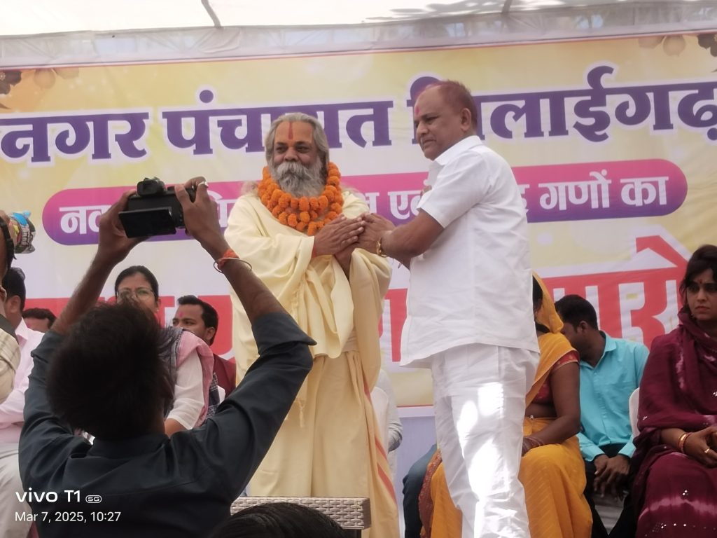 प्राप्त समाचार के अनुसार नगर पंचायत बिलाईगढ़ में आज नवनिर्वाचित अध्यक्ष दामोदर दुबे एवं पार्षद गणों का शपथ ग्रहण समारोह छत्तीसगढ़ राज्य के गौ सेवा आयोग के पूर्व अध्यक्ष महंत राम सुंदर दास महंत जी के मुख्य आतिथ्य में संपन्न हुआ । बिलाईगढ़ के एस डी एम वर्षा बंसल ने सर्वप्रथम नगर पंचायत अध्यक्ष दामोदर दुबे को तत्पश्चात सभी पार्षदों को शपथ दिलाया । गौ सेवा आयोग के पूर्व अध्यक्ष महंत रामसुंदर दास ने राम राज्य की कल्पना करते हुए अपने संबोधन में कहा कि दामोदर दुबे जी को आप सभी ने बहुमत के साथ जीताकर नगर पंचायत बिलाईगढ़ का अध्यक्ष बनाया है मैं विश्वास व्यक्त करता हूं कि दामोदर दुबे जी हमेशा आप सभी को साथ लेकर नगर पंचायत बिलाईगढ़ के सर्वांगीण विकास के लिए कार्य करेंगे ।